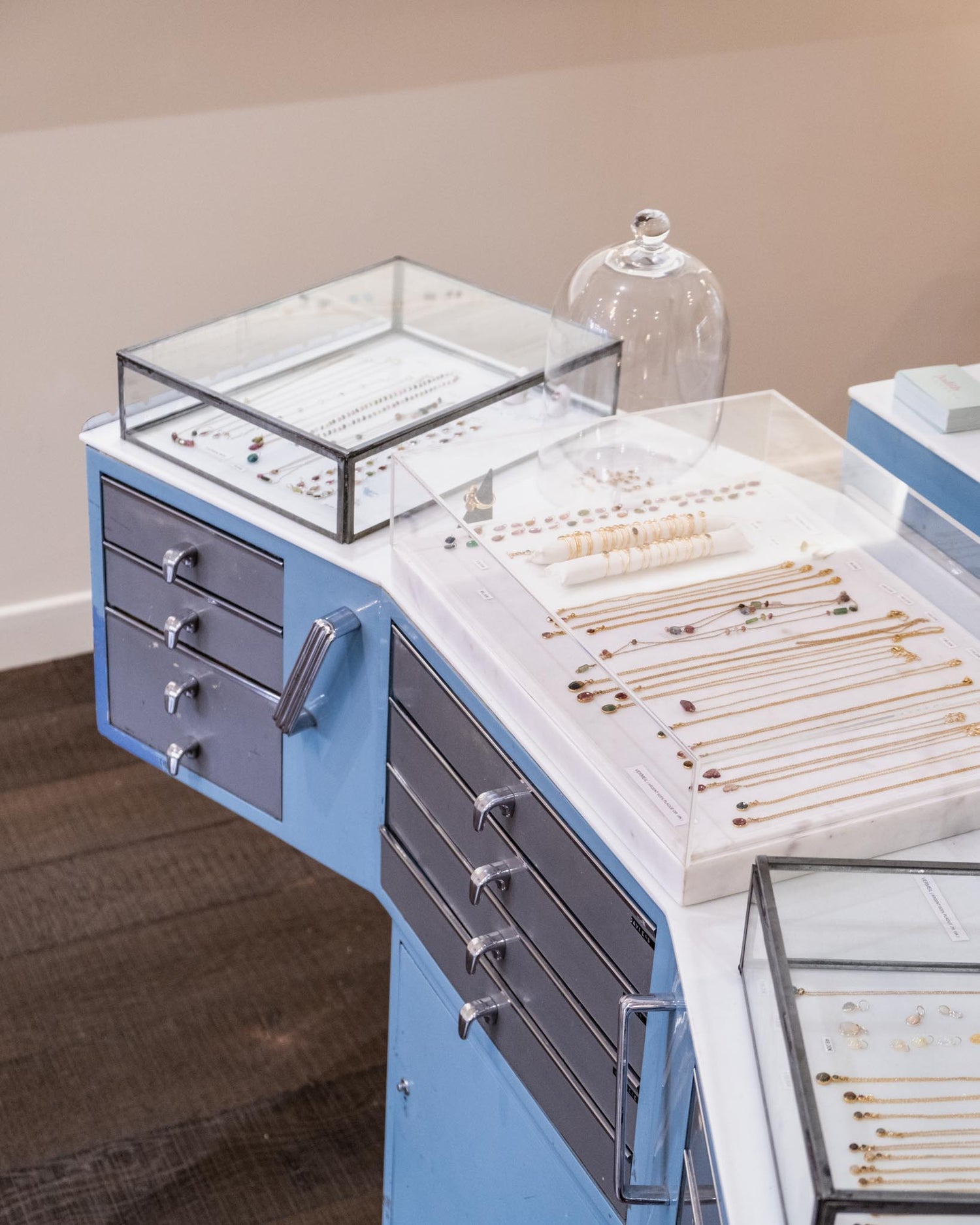 Display cases handcrafted by artisans with old automobile grilles, antique light blue furniture, unique vintage pieces...